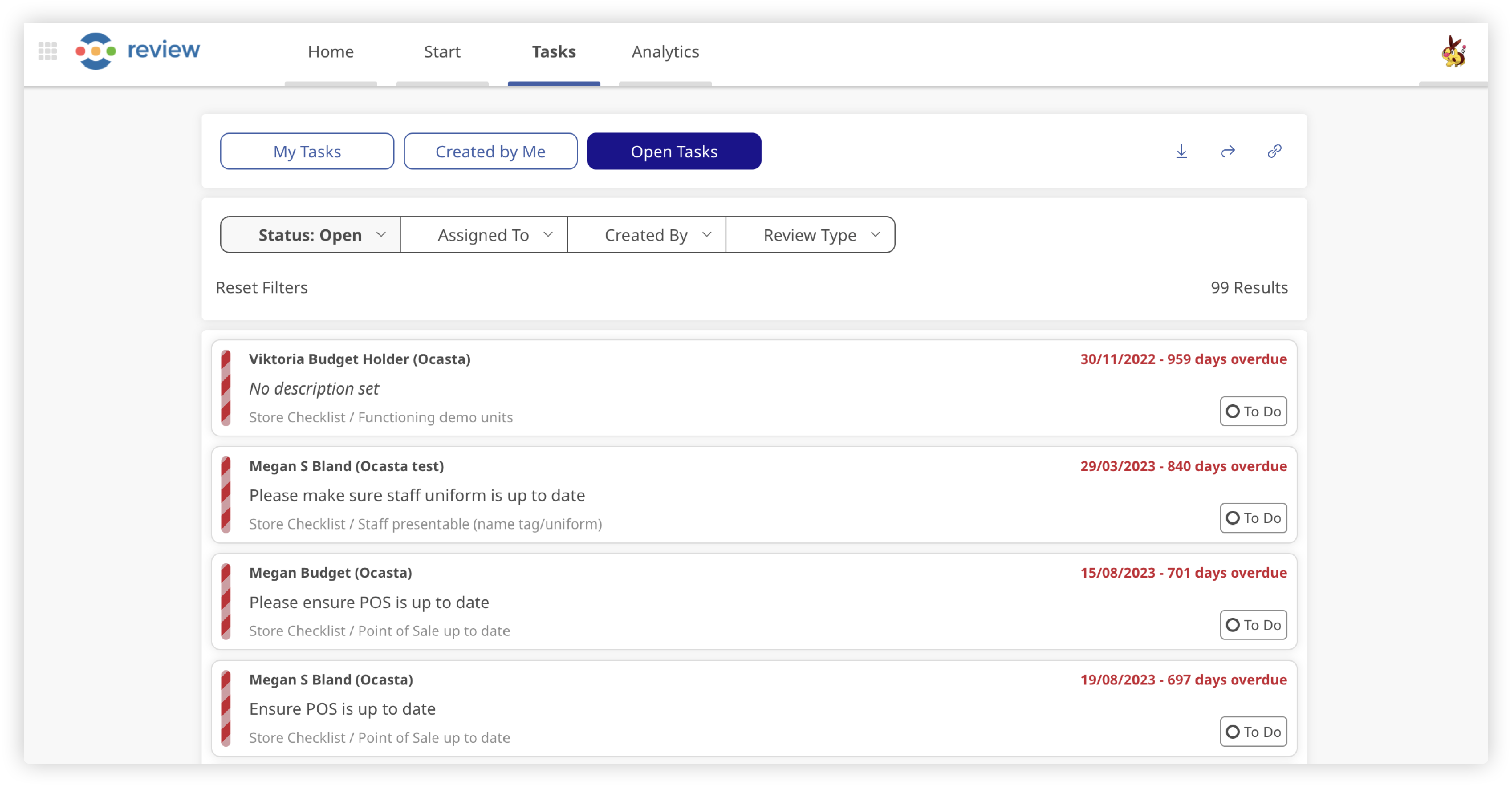 If your role has the right permissions, you can switch to the Open Tasks quick filter. What you see in this quick filter view and which tasks are shown depends on your role’s Review Roaming and Review Tasks permissions.