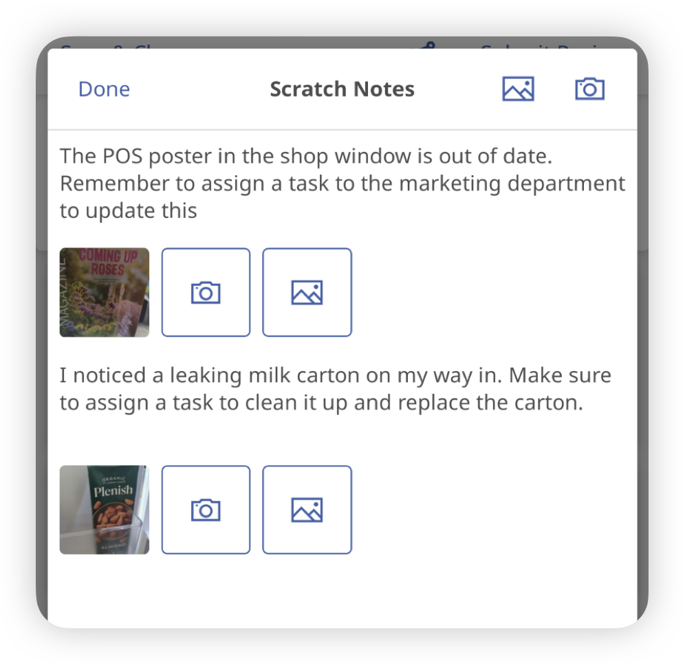 Scratch notes serve as a convenient tool for uploading temporary, useful information such as images and attachments, and for making notes whilst carrying out a review. For example you could use scratch notes for quick documentation of any observations or incidents that require follow-up but might be forgotten by the end of the review.