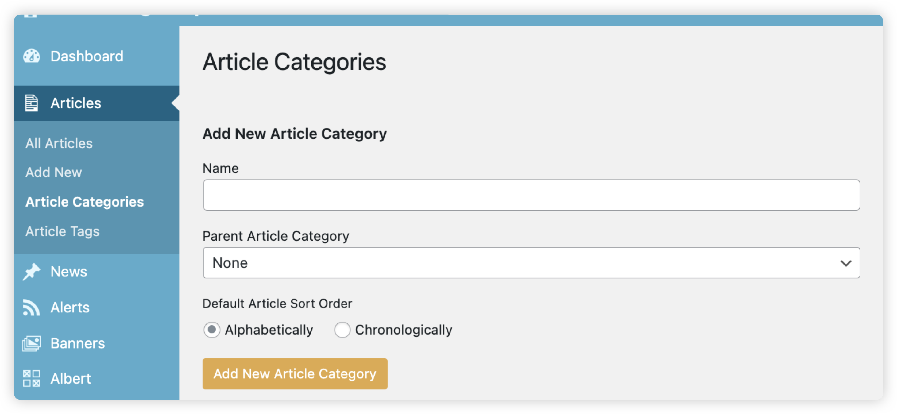 4. Type in the name which you want on your dash tile e.g. HR. Select the default article sort order, either chronologically or alphabetically. Then to confirm press the blue button which says 'Add New Article Category'.