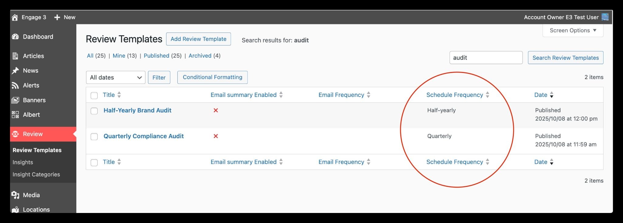 From the Review templates list in Admin, check the Schedule column. This shows whether a schedule exists and, if it does, the set frequency (for example, daily, monthly, or quarterly).