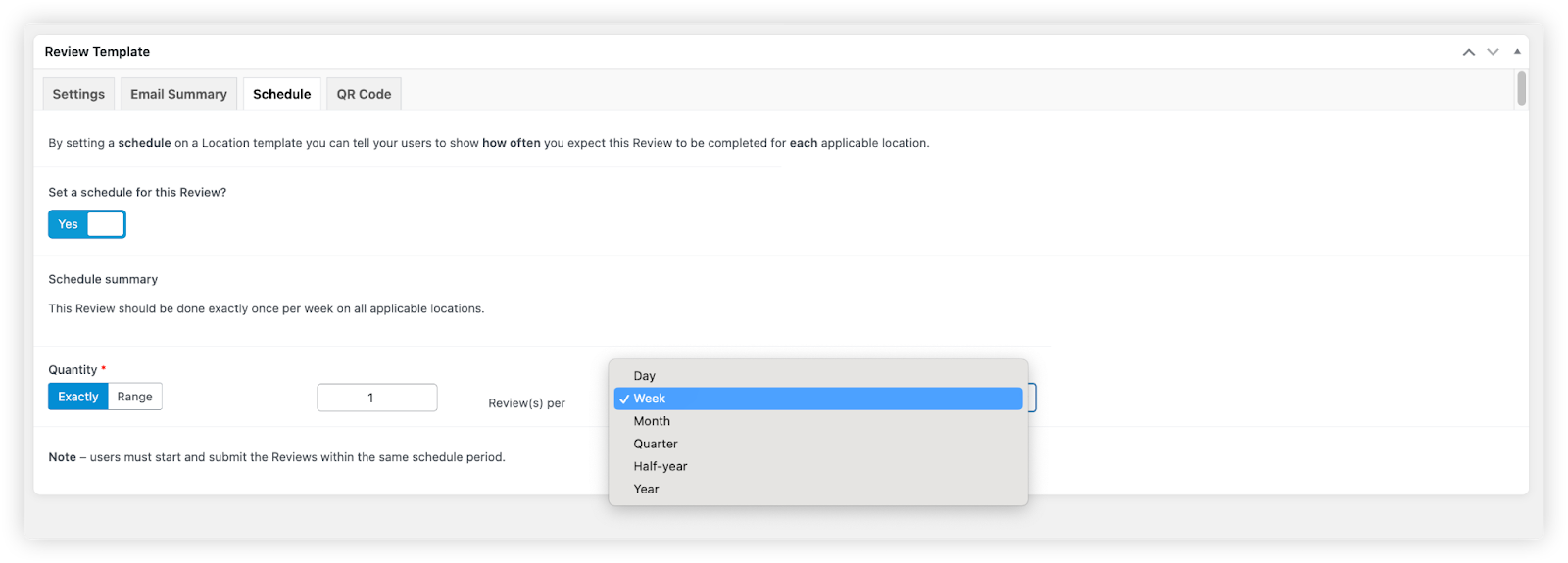 - Next to Set a schedule for this review, toggle Yes. You’ll then see options to set the Quantity and Frequency. By default, this is set to 1 review per week.