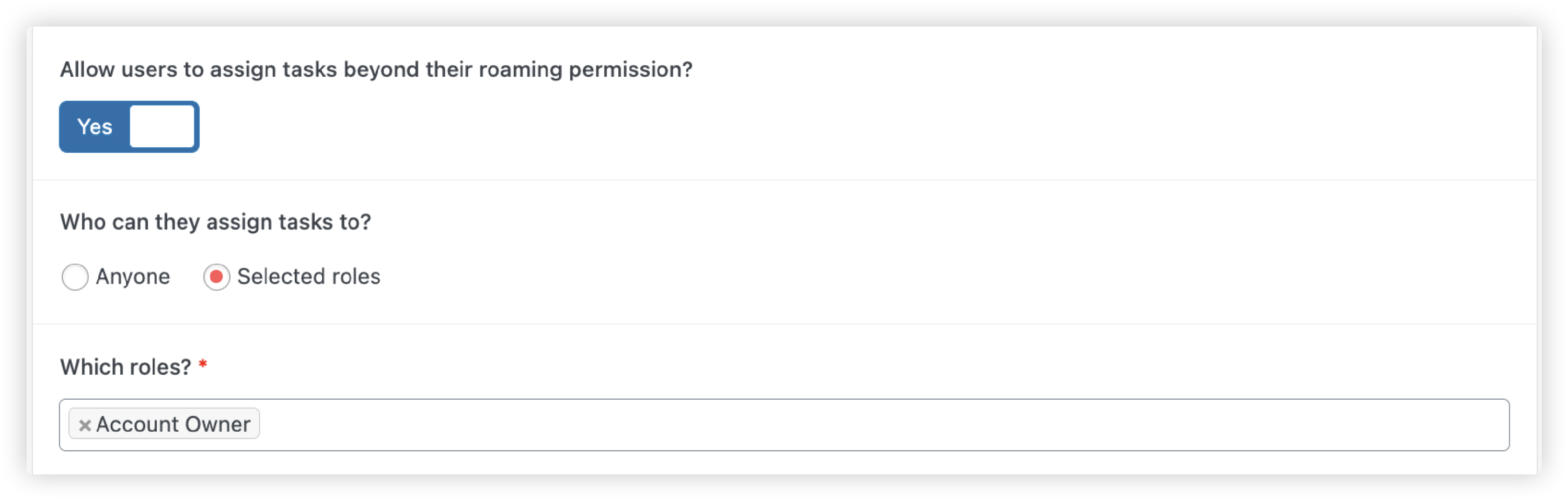 - Selected roles – allows users to assign tasks only to people with specific roles. Use the box below to enter which user roles can be assigned tasks.