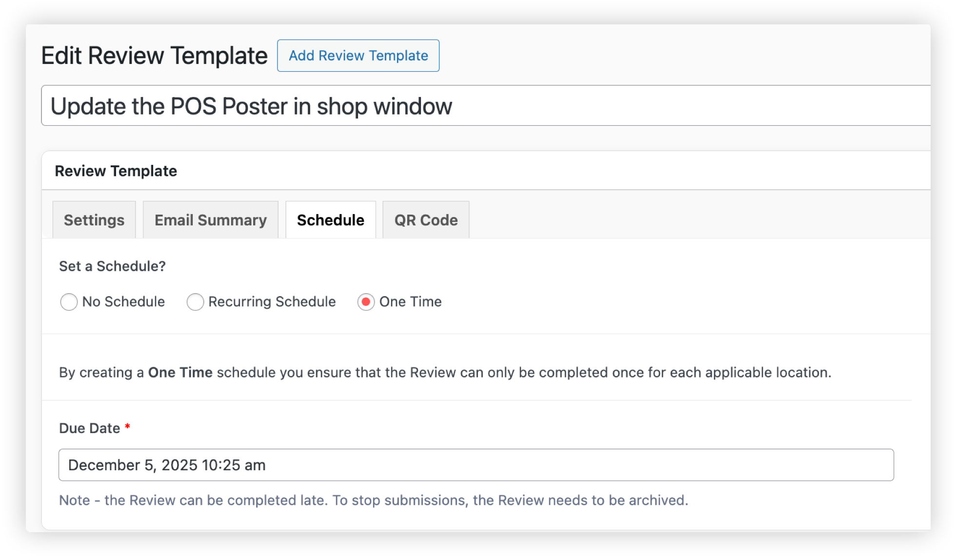 Sometimes you need every location to complete a single action — like updating a POS poster — and you still want clear reporting on who’s done it. That’s exactly what one time reviews are for.